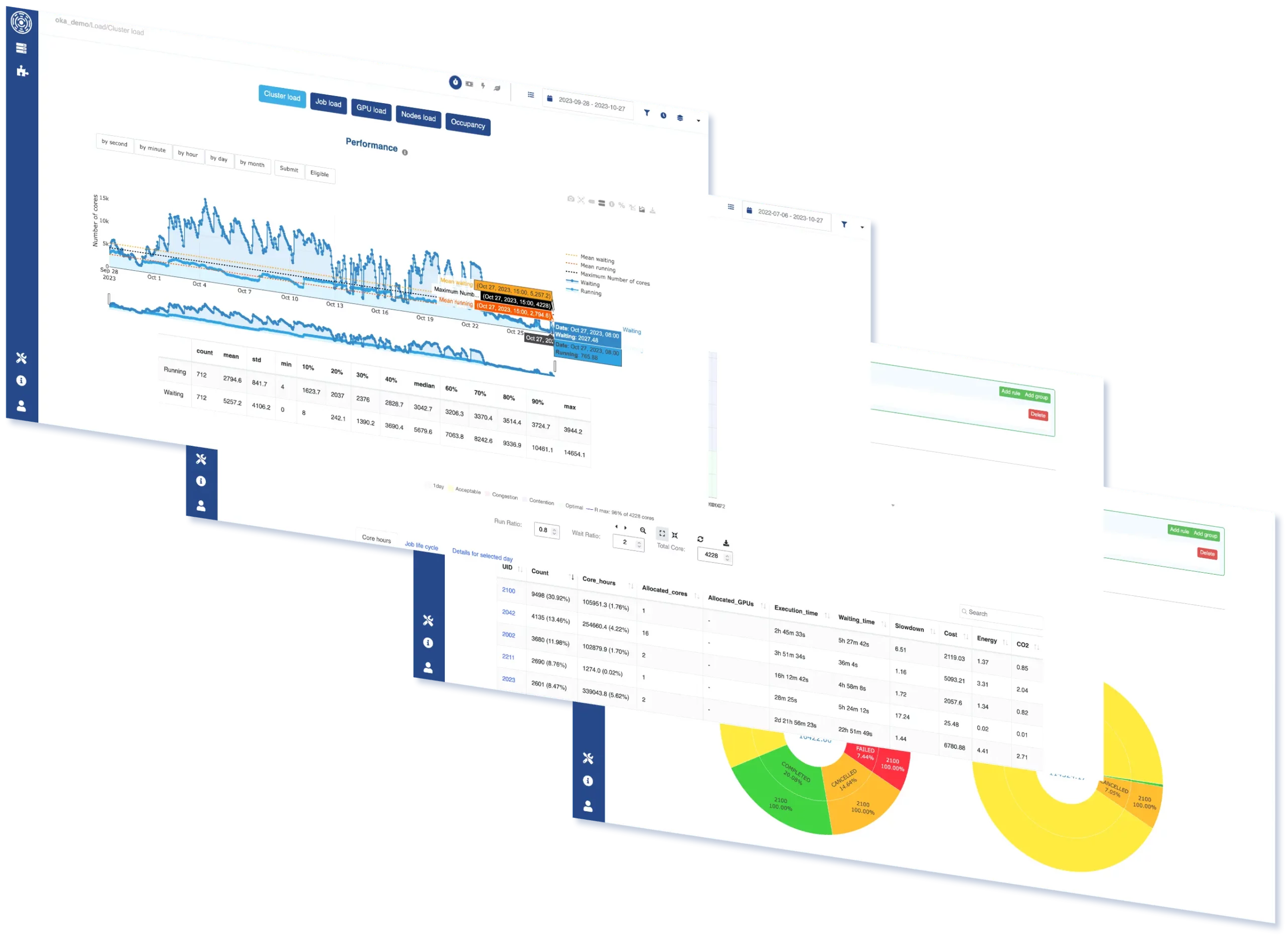 OKA provides 20+ HPC-native dashboards, built by cluster operations experts, giving both IT staff and end-users instant visibility into the cluster’s behavior. No custom development needed, no pipeline to build – just connect your scheduler accounting logs and explore.
