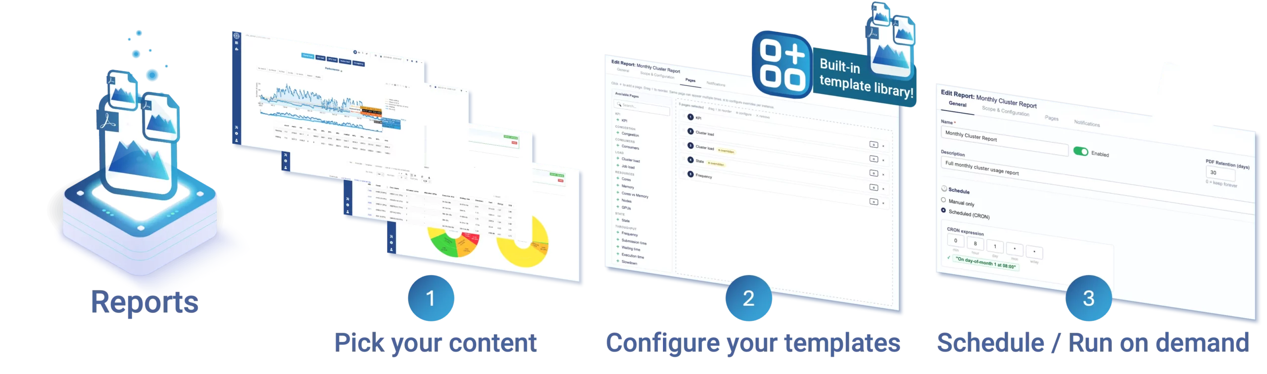 OKA’s Report Builder lets you define custom report templates once, then automate their generation and distribution on any schedule. Whether it’s a monthly executive summary, a per-team consumption breakdown, or a per-project job efficiency report – set it up once, and OKA handles the rest.